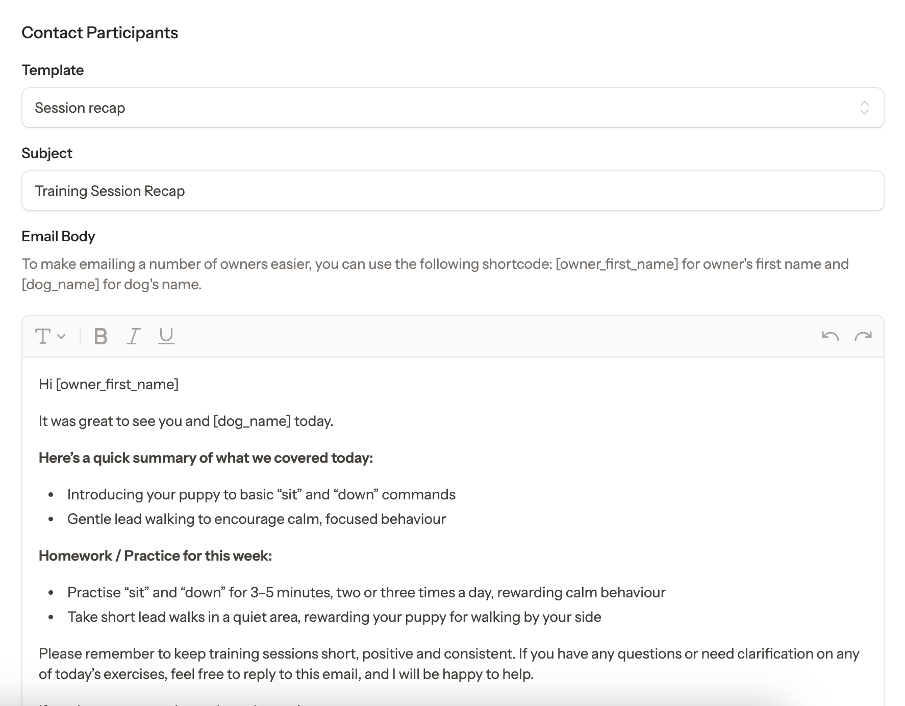 You control the content, and the system does the sending. That means you can focus on delivering great training sessions while DogTrainerSuite handles the admin.